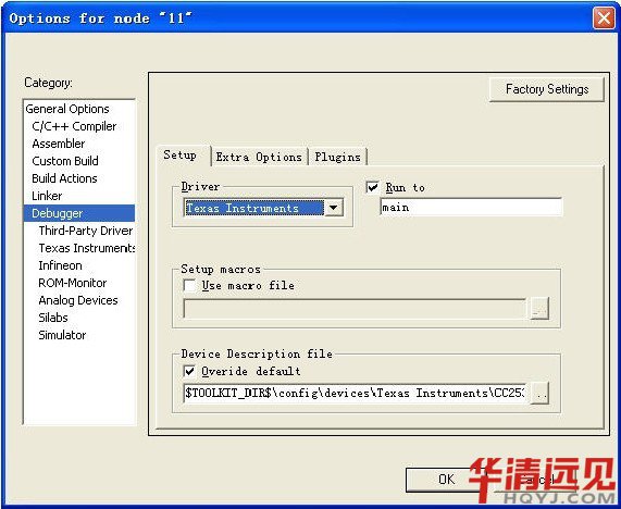 4 Debugger 項 Setup 標(biao)簽下 Driver 欄設置為"Texas Instruments"。
