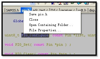 其中控制(zhi)芯片使(shi)用SAM3S4B,通(tong)過SPI格(ge)式(單一(yi)(yi)的SAM3S4B為(wei)主端,AT86RE231為(wei)從端)與AT86RF231進(jin)行通(tong)訊,AT86RF231是一(yi)(yi)款工(gong)業(ye)級,低電壓供電,超低功耗,方便操(cao)作(zuo),遵(zun)循IEEE802.15.4-2006 硬件標準。AT86RF231將控制(zhi)信號(hao)轉換為(wei)zigbee模式的差分對信號(hao),通(tong)過2.45Ghz的諧波(bo)(bo)濾波(bo)(bo)器2450FB15L0001濾波(bo)(bo)后接(jie)入(ru)天線與其余zigbee端點進(jin)行通(tong)訊,2450FB15L0001主要(yao)是對接(jie)受到得zigbee信號(hao)進(jin)行濾波(bo)(bo)。 Zigbee框架下(xia)編譯程序,需要進行些簡單的設置(zhi), 因(yin)為處與zigbee協議(yi)棧框架中,部分源碼被atmel,封(feng)裝(zhuang)起來,在(zai)man函數(shu)中,SYS_sysinit();系統(tong)初始化(hua)給出(chu).h文件(jian),而沒有具(ju)體的(de)C代碼。這(zhe)意味ZIGBEE的(de)具(ju)體結構(gou)核心部分不(bu)是開(kai)源的(de)。實際(ji)中SYS_sysinit()在(zai)libBc_All_At91sam3s4c_Rf231_Iar.a中,該文件(jian)被封(feng)裝(zhuang)起來。 其(qi)中,對(dui)(dui)bitcloud編譯生成(cheng)的是libHAL_Sam3sEkRf2xx_At91sam3s4c_64Mhz_Iar.a。 這里面(mian)即便被封住,我們可(ke)以進入bitcloud源碼內,解(jie)讀代(dai)(dai)碼,如(ru)WTD操作,HAL_InstallInterruptVector(),TimeTick_Configure()還是可(ke)以進行代(dai)(dai)碼解(jie)讀的。那對(dui)(dui)zigbee格式下(xia)的函數應該怎樣跟蹤解(jie)析(xi)代(dai)(dai)碼:例如(ru)pio.h中,PIO_Configure();無法看(kan)到C代(dai)(dai)碼的實現過(guo)程。可(ke)以鼠(shu)標右(you)擊pio.h文(wen)(wen)(wen)件(jian)(見下(xia)圖(tu)1),open containing folder,打(da)開文(wen)(wen)(wen)件(jian)夾,找到include中的pio.h文(wen)(wen)(wen)件(jian),可(ke)以推(tui)測出點C文(wen)(wen)(wen)件(jian)如(ru)果有,應該存在于source中。進行代(dai)(dai)碼解(jie)讀。