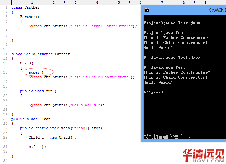 我們知道,使用new操作符,我們會調用類中相應的構造器,所以,在執行"Child c = new Child(); "這條語句時,我們應該去調用子類中無參的構造器,但是在子類Child中貌似沒有構造器。這時大家要注意了,其實我們每個類中,實際上是有一個無參的構造器的。但是,如果程序員自定義了構造器,這時我們只能使用自己的構造器。所以,這時也不難理解,為什么我們new子類實例,是沒有報錯的了!所以,我們添上一個無參構造器,結果也是一樣的。