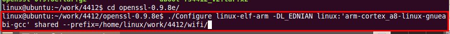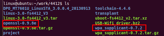 將\Cortex-A9\移(yi)植部(bu)分\Wifi\wifi加密源碼(ma)目(mu)(mu)錄中openssl-0.9.8e.tar和wpa_supplicant-0.7.2.tar拷貝(bei)到Ubuntu工作(zuo)目(mu)(mu)錄(此文檔(dang)以/home/linux/work/4412為工作(zuo)目(mu)(mu)錄)