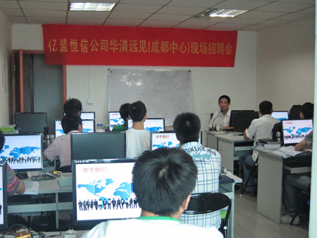 在通過對華(hua)清(qing)遠見的(de)(de)(de)接觸了解,并結合之(zhi)前入職(zhi)公司的(de)(de)(de)學員表現(xian)情況,成(cheng)都億盟恒信(xin)科技有限公司于2011年(nian)8月31日搶先來(lai)到了成(cheng)都中(zhong)心,對在校1105期(qi)學員進行了三個多小時的(de)(de)(de)現(xian)場招(zhao)聘活動。當天來(lai)到中(zhong)心負(fu)(fu)責(ze)招(zhao)聘的(de)(de)(de)兩位(wei)(wei)負(fu)(fu)責(ze)人(ren)分別(bie)是公司潘(pan)總(zong)以及招(zhao)聘負(fu)(fu)責(ze)人(ren)江(jiang)小姐(jie)。本次(ci)招(zhao)聘受華(hua)清(qing)遠見成(cheng)都中(zhong)心的(de)(de)(de)熱烈(lie)歡迎,中(zhong)心負(fu)(fu)責(ze)人(ren)陶老師(shi)(shi)以及教學潘(pan)老師(shi)(shi)等分別(bie)與兩位(wei)(wei)負(fu)(fu)責(ze)人(ren)進行了友好的(de)(de)(de)交談。