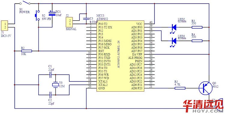 通過單(dan)片(pian)機AT89S52控制(zhi)紅色(se)(se)LED2、綠色(se)(se)LED1、蜂鳴器(qi)U1和(he)監測(ce)信號端口J2,C3排除干擾信號。圖中S2、EC1和(he)R2組成單(dan)片(pian)機復位電路(lu),三極管Q0起音頻(pin)放大作(zuo)用,晶(jing)振Y0為12MHz,J1接DC5V電源。