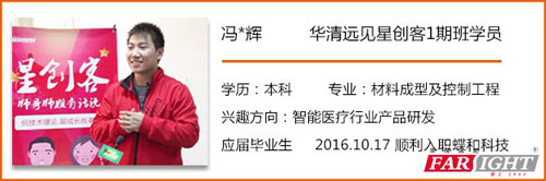 應(ying)屆(jie)生“輝(hui)輝(hui)”鐘情智能醫療行(xing)業 Part 1 輝輝細數1期班全班同學在星創客的點點滴滴 輝輝一定是一個有情懷(huai)的漢紙,因為(wei)畢(bi)業2個多(duo)月了,他對(dui)同窗好友們(men)的座位分布和(he)學習狀(zhuang)態(tai)如數(shu)家(jia)珍,點滴話語中(zhong)透露(lu)出他對(dui)那段(duan)拼搏的時光無比懷(huai)念: “搞技術很(hen)牛X的(de)(de)(de)(de)“張導(dao)(dao)”,被(bei)大(da)家視為全班(ban)零食店的(de)(de)(de)(de)女(nv)同(tong)(tong)學(xue),瘋狂學(xue)驅動(dong)的(de)(de)(de)(de)“老(lao)(lao)牛”,逗逼(bi)青年“李逗比”,渴求知識而繼續深造的(de)(de)(de)(de)“小松同(tong)(tong)志”,在Linux和Android造詣極高(gao)的(de)(de)(de)(de)“猛哥”,3天搞完物聯網(wang)項目整個(ge)流程的(de)(de)(de)(de)“楊同(tong)(tong)學(xue)”,進行二次深造的(de)(de)(de)(de)“白(bai)大(da)俠”,Android方面(mian)的(de)(de)(de)(de)大(da)牛“另一個(ge)張導(dao)(dao)”,心思縝密用云筆記整理思路的(de)(de)(de)(de)王同(tong)(tong)學(xue),不到(dao)一個(ge)月時間搞出畢(bi)業設計“戰神(shen)”,能一個(ge)人從(cong)應用層(ceng)寫到(dao)底(di)層(ceng)的(de)(de)(de)(de)大(da)牛“韓導(dao)(dao)”,在上海做(zuo)前(qian)景很(hen)好的(de)(de)(de)(de)驅動(dong)相關工作(zuo)的(de)(de)(de)(de)“栗子”,整天上課(ke)調皮搗蛋的(de)(de)(de)(de)自己,做(zuo)圖像處理和算法控制的(de)(de)(de)(de)技術大(da)咖黃(huang)同(tong)(tong)學(xue),出口成詩的(de)(de)(de)(de)班(ban)長,見多(duo)識廣(guang)的(de)(de)(de)(de)“宋(song)老(lao)(lao)司機”……”