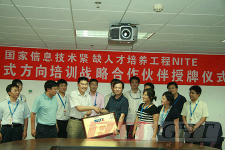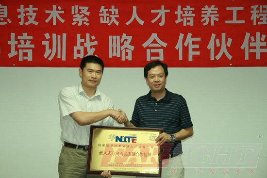 (圖一)左:華清遠(yuan)見總裁(cai)季久(jiu)峰, 右:CSIP副主任邱善勤(qin)博(bo)士 2009年(nian)7月31日,華(hua)清(qing)遠見嵌入式(shi)培(pei)(pei)訓(xun)中心(xin)與工(gong)業(ye)和(he)信(xin)息(xi)化(hua)部(bu)軟件與集(ji)成電路(lu)促進(jin)中心(xin)(簡稱CSIP)簽署了(le)(le)合作(zuo)協(xie)議,并舉行了(le)(le)隆重的合作(zuo)伙(huo)伴(ban)授(shou)牌儀式(shi)。工(gong)業(ye)和(he)信(xin)息(xi)化(hua)部(bu)軟件與集(ji)成電路(lu)促進(jin)中心(xin)副主任(ren)(ren)邱(qiu)善勤博(bo)士、教育培(pei)(pei)訓(xun)部(bu)吳宏雷主任(ren)(ren)、華(hua)清(qing)遠見總裁(cai)季久峰及(ji)相關負責人出席了(le)(le)此(ci)(ci)次(ci)授(shou)牌儀式(shi)。自此(ci)(ci),華(hua)清(qing)遠見正式(shi)成為信(xin)息(xi)技(ji)術緊缺人才(cai)培(pei)(pei)養(yang)工(gong)程(National Information Technology Education Project,簡稱NITE)培(pei)(pei)訓(xun)戰略合作(zuo)伙(huo)伴(ban)。憑(ping)借(jie)多年(nian)在嵌入式(shi)專業(ye)領域內的卓(zhuo)越(yue)貢(gong)獻和(he)權威地位,華(hua)清(qing)遠見也成為了(le)(le)首家獲NITE授(shou)權的嵌入式(shi)方向培(pei)(pei)訓(xun)機構。 信息(xi)技(ji)術(shu)(shu)(shu)(shu)緊缺(que)人(ren)才培養工(gong)(gong)程(cheng)(cheng)(NITE)是由(you)工(gong)(gong)業和信息(xi)化部直接指導,軟件與(yu)集成電(dian)路促進中心(CSIP)承擔并組(zu)織(zhi)外眾(zhong)多(duo)企業、研究機(ji)構和教育培訓(xun)(xun)機(ji)構,于2006年1月1日在全國范圍內啟動的(de)(de)(de)緊缺(que)人(ren)才培養項目,NITE定位于重(zhong)點領域的(de)(de)(de)緊缺(que)人(ren)才培養。 NITE嵌(qian)入式培養是聯合中電(dian)網(wang)(wang)、清華大學等(deng)知名(ming)高等(deng)學府(fu)、多(duo)家著名(ming)電(dian)子技(ji)術(shu)(shu)(shu)(shu)提(ti)(ti)供商及華清遠見等(deng)專(zhuan)業培訓(xun)(xun)機(ji)構共同推出的(de)(de)(de)首(shou)個級電(dian)子工(gong)(gong)程(cheng)(cheng)技(ji)術(shu)(shu)(shu)(shu)網(wang)(wang)上網(wang)(wang)下結合的(de)(de)(de)培訓(xun)(xun)項目。該(gai)項目專(zhuan)門針對(dui)目前電(dian)子工(gong)(gong)程(cheng)(cheng)人(ren)才緊缺(que)的(de)(de)(de)現狀(zhuang),旨在通過基(ji)礎理論(lun)學習(xi)與(yu)動手實(shi)踐相(xiang)結合的(de)(de)(de)方式,為電(dian)子工(gong)(gong)程(cheng)(cheng)技(ji)術(shu)(shu)(shu)(shu)人(ren)員提(ti)(ti)供系統學習(xi)前沿、熱門電(dian)子工(gong)(gong)程(cheng)(cheng)技(ji)術(shu)(shu)(shu)(shu)的(de)(de)(de)機(ji)會。通過該(gai)培訓(xun)(xun)項目認(ren)證考試的(de)(de)(de)工(gong)(gong)程(cheng)(cheng)師將獲(huo)得(de)“信息(xi)技(ji)術(shu)(shu)(shu)(shu)應用技(ji)能證書”(電(dian)子工(gong)(gong)程(cheng)(cheng)與(yu)集成電(dian)路技(ji)術(shu)(shu)(shu)(shu)專(zhuan)業)。