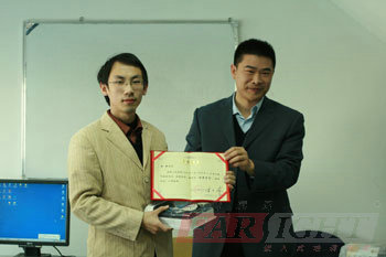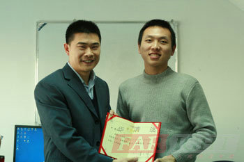 | 圖五、華清遠見教育科技集團院長季老師為優秀學員何亮頒獎 | 圖六、華清遠見教育科技集團院長季老師為優秀學員白杰頒獎 |
