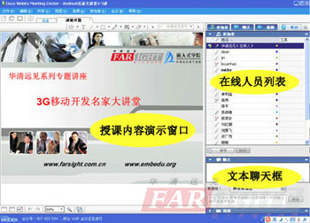 2009年11月26日,華清遠見3G移動開發名家大講堂通過網絡直播課堂的形式正式上線,來自全國各地的Andriod技術愛好者借助新穎的網絡課堂、足不出戶就有機會與華清遠見3G學院的著名講師進行實時互動,共同交流新移動開發技術的真實需求和企業應用。數百位在校學生和在職工程師在自己的宿舍或者辦公室內借助先進的網絡視頻系統與華清遠見的老師直接進行交流。在2010年1月28日該活動結束當天,許多朋友都紛紛要求華清遠見能夠在新的一年舉辦更多這樣的免費、在線視頻講座,讓外地的朋友也能夠有機會享受到華清遠見技術專家的獨特魅力!