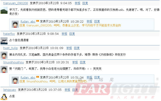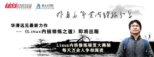 2010年(nian)5月,由華(hua)清遠(yuan)見(jian)教(jiao)材(cai)研發中(zhong)心(xin)策劃,華(hua)清遠(yuan)見(jian)嵌(qian)入式培訓中(zhong)心(xin)資深講(jiang)師任老師編寫、人民郵(you)電出(chu)版社(she)出(chu)版發行(xing)的(de)《Linux內核(he)修(xiu)煉之道》一書即將在(zai)上市(shi)。此前,該(gai)書的(de)部(bu)分章節內容已經通過(guo)相關的(de)博客在(zai)CSDN、51CTO、ChinaUnix等(deng)專業技術(shu)網站中(zhong)陸續發布,這些技術(shu)文章一經發布即獲得了(le)業內嵌(qian)入式Linux內核(he)技術(shu)愛好者的(de)普遍關注,并引(yin)發了(le)網友的(de)熱(re)議。
