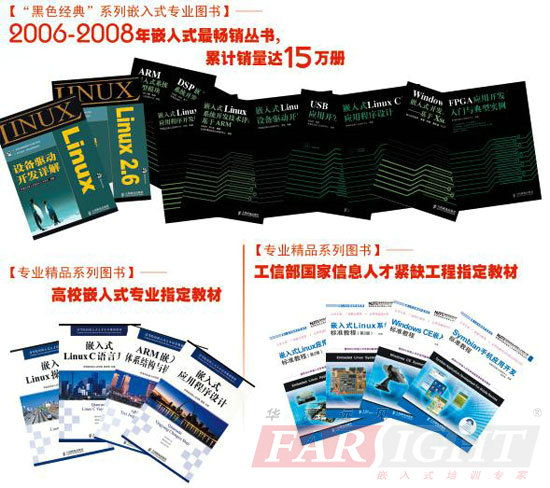 華清(qing)遠見作為(wei)嵌(qian)(qian)(qian)入(ru)(ru)式高(gao)端(duan)培(pei)訓(xun)(xun)的(de)(de)旗(qi)艦(jian)品牌,實用(yong)的(de)(de)課程內(nei)容和高(gao)水(shui)準的(de)(de)專(zhuan)(zhuan)家(jia)(jia)師資團隊始(shi)終是華清(qing)遠見高(gao)端(duan)培(pei)訓(xun)(xun)業(ye)務快速發展的(de)(de)核心(xin)(xin)動力。從(cong)成立之初,華清(qing)遠見就專(zhuan)(zhuan)門設立了從(cong)事專(zhuan)(zhuan)業(ye)圖書(shu)及教(jiao)材開發的(de)(de)“培(pei)訓(xun)(xun)教(jiao)材研(yan)發中心(xin)(xin)”,研(yan)發中心(xin)(xin)的(de)(de)專(zhuan)(zhuan)家(jia)(jia)團隊每年都會(hui)通過(guo)對數百家(jia)(jia)嵌(qian)(qian)(qian)入(ru)(ru)式企業(ye)的(de)(de)深層調研(yan),編寫大量的(de)(de)專(zhuan)(zhuan)業(ye)圖書(shu),截止(zhi)到目前(qian),由華清(qing)遠見專(zhuan)(zhuan)家(jia)(jia)編寫出版的(de)(de)專(zhuan)(zhuan)業(ye)圖書(shu)已經近四十多本,這些(xie)圖書(shu)已成為(wei)嵌(qian)(qian)(qian)入(ru)(ru)式行業(ye)中權(quan)威的(de)(de)圖書(shu),數年蟬聯嵌(qian)(qian)(qian)入(ru)(ru)式圖書(shu)榜首,成為(wei)廣(guang)大嵌(qian)(qian)(qian)入(ru)(ru)式愛好者的(de)(de)貼心(xin)(xin)學習(xi)教(jiao)材,保守估計(ji)有超過(guo)十萬的(de)(de)讀者從(cong)中受益。后續(xu),華清(qing)遠見嵌(qian)(qian)(qian)入(ru)(ru)式培(pei)訓(xun)(xun)中心(xin)(xin)也將繼(ji)續(xu)跟人民(min)郵電出版社合作,整(zheng)理(li)匯總(zong)更(geng)多的(de)(de)業(ye)內(nei)技(ji)術(shu)經驗(yan)和項目實戰經驗(yan),為(wei)廣(guang)大的(de)(de)嵌(qian)(qian)(qian)入(ru)(ru)式技(ji)術(shu)愛好者奉獻更(geng)多專(zhuan)(zhuan)業(ye)、實用(yong)、經典的(de)(de)圖書(shu)!