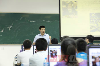 | 圖一、華清遠見總裁季久峰老師為開學典禮致辭 | 圖二、曾老師詳細介紹華清遠見教育科技集團課程體系及授課安排 |