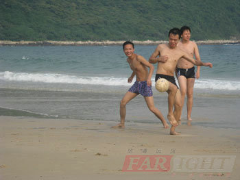 過(guo)了(le)近兩個(ge)(ge)小(xiao)時,食物被我(wo)們解決的差(cha)不多了(le)。為(wei)了(le)在(zai)回去(qu)前再感受一(yi)下大(da)海(hai),喜歡游泳(yong)的人(ren)又投進了(le)大(da)海(hai)的懷抱(bao)。大(da)海(hai)退(tui)潮了(le),在(zai)金黃的沙(sha)灘上留下了(le)一(yi)條深色的沙(sha)帶,那里的沙(sha)子細膩而濕(shi)潤,腳踏在(zai)上面,好舒服啊!幾個(ge)(ge)學(xue)員(yuan)在(zai)這個(ge)(ge)沙(sha)帶上進行足球大(da)戰,兩隊人(ren)馬開始(shi)了(le)攻防賽……
