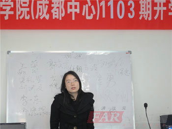 | 圖一、華清遠見成都中心負責人陶老師致辭 | 圖二、李老師關于四個月學習內容及方法的交流 |