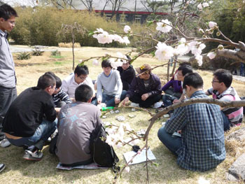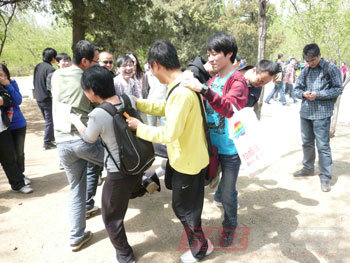 剛進入(ru)園內不久,看(kan)到不同(tong)(tong)的(de)(de)景點時,段導(dao)都會(hui)很負責任的(de)(de)解說此景點的(de)(de)來源及典故(gu)。在賞花的(de)(de)過程(cheng)(cheng)中,不斷有新的(de)(de)成(cheng)員(yuan)加入(ru)我(wo)(wo)們(men)的(de)(de)隊伍。為(wei)了(le)讓更(geng)多(duo)的(de)(de)因(yin)堵車遲到的(de)(de)學(xue)(xue)員(yuan)找得到大(da)隊伍,我(wo)(wo)們(men)在一片(pian)小樹蔭下(xia)組(zu)(zu)織(zhi)一次游戲。用(yong)形體猜成(cheng)語,同(tong)(tong)學(xue)(xue)們(men)非常(chang)配合用(yong)手和形體不斷的(de)(de)演示(shi),生(sheng)怕表達的(de)(de)不夠準備(bei)。正所謂人多(duo)力(li)量(liang)大(da),短(duan)短(duan)幾分鐘內,準備(bei)的(de)(de)20個(ge)詞組(zu)(zu)都被(bei)猜中。于是(shi),我(wo)(wo)們(men)又開(kai)展新游戲“紅牌,黃牌”游戲。看(kan)同(tong)(tong)學(xue)(xue)們(men)圍成(cheng)一圈(quan),當班主任老師喊出(chu)(chu)一句“千萬(wan)不要(yao)不舉(ju)起紅牌”時,同(tong)(tong)學(xue)(xue)們(men)開(kai)始糾(jiu)結,是(shi)舉(ju)起還是(shi)放(fang)下(xia)呢。在這過程(cheng)(cheng)中,我(wo)(wo)們(men)的(de)(de)段導(dao)兼裁判(pan)(pan)火(huo)眼晶晶抓住幾個(ge)判(pan)(pan)斷出(chu)(chu)錯的(de)(de)學(xue)(xue)員(yuan)。為(wei)了(le)體會(hui)童年的(de)(de)樂趣,我(wo)(wo)們(men)組(zu)(zu)織(zhi)出(chu)(chu)錯的(de)(de)學(xue)(xue)員(yuan)“編花籃(lan)”游戲,同(tong)(tong)學(xue)(xue)們(men)在過程(cheng)(cheng)開(kai)懷大(da)笑(xiao),笑(xiao)出(chu)(chu)純真的(de)(de)我(wo)(wo)們(men),笑(xiao)出(chu)(chu)年輕的(de)(de)我(wo)(wo)們(men)。