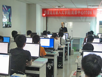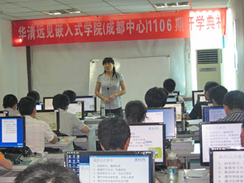 | 圖一、華清遠見成都中心校長陶老師致辭 | 圖二、潘老師課程體系和學習要點講解 |