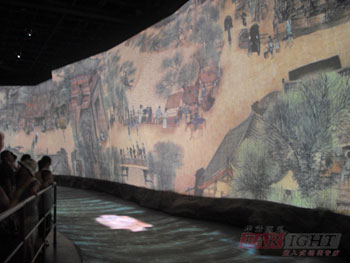 一(yi)(yi)進館我(wo)(wo)(wo)們乘電梯直奔(ben)“東方足跡”,春天的(de)故事(shi)響徹大(da)江南北,中(zhong)(zhong)華啊展開了(le)嶄新的(de)畫卷,追隨著這句(ju)鏗鏘有(you)力的(de)詩(shi)句(ju),我(wo)(wo)(wo)們欣賞(shang)(shang)了(le)一(yi)(yi)部展現發(fa)展巨變(bian)的(de)紀錄片——和(he)諧,這部影片極具表現力,震撼(han)了(le)我(wo)(wo)(wo)們的(de)心,它(ta)從一(yi)(yi)個家庭入手(shou),從衣食住行方面展現了(le)生(sheng)活的(de)巨變(bian),我(wo)(wo)(wo)們不(bu)禁由衷的(de)贊嘆(tan):祖國(guo)您變(bian)化真(zhen)大(da),簡(jian)直就是一(yi)(yi)天換(huan)一(yi)(yi)件新衣啊。從這個影院里走出,剛(gang)(gang)剛(gang)(gang)電影里的(de)一(yi)(yi)幕幕還在腦海(hai)中(zhong)(zhong)不(bu)斷呈(cheng)現。各種(zhong)場景是那么(me)逼真(zhen)。伴(ban)隨著輕快地腳步,我(wo)(wo)(wo)們又(you)搭(da)乘時光隧道,回到北宋年間,欣賞(shang)(shang)張擇端的(de)《清明上(shang)河圖(tu)》,畫上(shang)的(de)人物栩栩如生(sheng),讓人有(you)種(zhong)身臨其境的(de)感(gan)覺。聽旁邊的(de)導游說(shuo)是用(yong)一(yi)(yi)塊長100米(mi)寬2米(mi)的(de)屏幕播放出來的(de)。