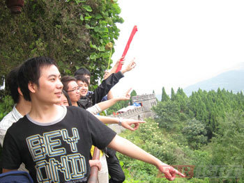 午飯后我(wo)(wo)(wo)們就趕向開往金(jin)龍長城的(de)(de)(de)班(ban)車。班(ban)車帶我(wo)(wo)(wo)們一(yi)路沖到(dao)長城腳下(xia)。看見這巍峨綿延(yan)的(de)(de)(de)長城,激發(fa)我(wo)(wo)(wo)們登(deng)上(shang)頂(ding)的(de)(de)(de)決心。攀登(deng)中(zhong),大(da)(da)家累(lei)了(le)(le)就相互攙扶,一(yi)路高歌斗志昂揚(yang)的(de)(de)(de)向前(qian)進。途中(zhong)路過(guo)寺廟,有(you)學員還專(zhuan)門(men)買了(le)(le)香去燒香拜(bai)佛(fo)了(le)(le)一(yi)番(fan)。還饒有(you)興致的(de)(de)(de)瞇眼摸前(qian)面(mian)那個(ge)大(da)(da)大(da)(da)的(de)(de)(de)佛(fo)字,看看是(shi)(shi)不(bu)是(shi)(shi)與佛(fo)有(you)緣(yuan)。當(dang)我(wo)(wo)(wo)們到(dao)達長城頂(ding)端的(de)(de)(de)時候,擺在我(wo)(wo)(wo)們面(mian)前(qian)的(de)(de)(de)是(shi)(shi)一(yi)個(ge)大(da)(da)大(da)(da)的(de)(de)(de)寺廟,掛滿了(le)(le)紅(hong)(hong)紅(hong)(hong)的(de)(de)(de)絲帶,寫(xie)著人們的(de)(de)(de)各種小(xiao)愿望小(xiao)心情。當(dang)然我(wo)(wo)(wo)們這群環抱夢(meng)想的(de)(de)(de)小(xiao)青年們也寫(xie)下(xia)了(le)(le)自己的(de)(de)(de)愿望和想法(fa)。