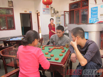 | 圖一、入席聚餐 | 圖二、兩人下象棋,一人觀戰 |