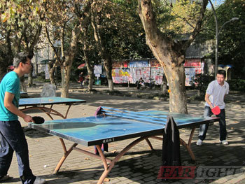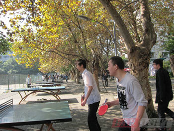在(zai)(zai)(zai)(zai)挨著(zhu)的(de)三(san)個球(qiu)(qiu)(qiu)場(chang)上不時(shi)地(di)可以看(kan)到:從羽(yu)毛球(qiu)(qiu)(qiu)場(chang)跑(pao)到乒(ping)乓(pang)(pang)球(qiu)(qiu)(qiu)臺進(jin)(jin)行切磋(cuo)的(de),從乒(ping)乓(pang)(pang)球(qiu)(qiu)(qiu)臺,碾轉到籃球(qiu)(qiu)(qiu)場(chang)搶籃板的(de),籃球(qiu)(qiu)(qiu)到乒(ping)乓(pang)(pang)球(qiu)(qiu)(qiu),乒(ping)乓(pang)(pang)球(qiu)(qiu)(qiu)到籃球(qiu)(qiu)(qiu),乒(ping)乓(pang)(pang)球(qiu)(qiu)(qiu)到羽(yu)毛球(qiu)(qiu)(qiu),整個球(qiu)(qiu)(qiu)場(chang)竄(cuan)動(dong)著(zhu)我們的(de)人馬,呵(he)呵(he)其(qi)實(shi),在(zai)(zai)(zai)(zai)跑(pao)動(dong)中還有(you)一項(xiang)運動(dong):短(duan)跑(pao),也在(zai)(zai)(zai)(zai)悄然進(jin)(jin)行。盡(jin)管有(you)短(duan)跑(pao),但其(qi)實(shi),整個過程大(da)(da)家運動(dong)的(de)節(jie)奏更像(xiang)心(xin)情一樣,舒(shu)緩地(di)在(zai)(zai)(zai)(zai)進(jin)(jin)行。拍照、擺pose、觀(guan)戰、調侃、參戰、跑(pao)場(chang),東拉西(xi)扯、左顧(gu)右盼(pan)、評頭(tou)論足盡(jin)情玩笑,是(shi)一場(chang)好友的(de)聚會,輕(qing)松隨意,充滿(man)歡樂。一個上午的(de)時(shi)間,大(da)(da)家互相切磋(cuo)球(qiu)(qiu)(qiu)技的(de)同時(shi),更在(zai)(zai)(zai)(zai)一種不同平日的(de)輕(qing)松環境中進(jin)(jin)行交流,感覺(jue)更親近了(le)不少(shao)。