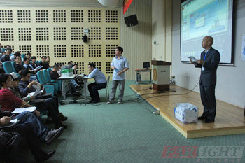 | 圖一、會場席位已滿,學員紛紛排序階梯認真聽課 | 圖二、易老師講解精華部分 |