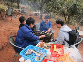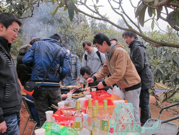 到了(le)半邊(bian)山燒(shao)烤(kao)場地(di),大(da)家(jia)都分工(gong)合作開來(lai)。一邊(bian)是(shi)幾(ji)個同(tong)學(xue)拿了(le)幾(ji)把小(xiao)小(xiao)菜(cai)(cai)刀,開始(shi)(shi)(shi)了(le)殺魚去魚鱗,這個場景可是(shi)獲得了(le)旁邊(bian)另外一隊(dui)烤(kao)燒(shao)烤(kao)團體的(de)一致好評哦(e)......有(you)的(de)同(tong)學(xue)就(jiu)到廚(chu)房去端來(lai)了(le)油、鹽巴、雞(ji)精等各(ge)(ge)種作料......有(you)的(de)同(tong)學(xue)拿來(lai)了(le)燒(shao)烤(kao)的(de)各(ge)(ge)個工(gong)具,如(ru)串燒(shao)烤(kao)的(de)簽(qian)(qian)簽(qian)(qian)等......有(you)的(de)同(tong)學(xue)就(jiu)開始(shi)(shi)(shi)洗菜(cai)(cai)切(qie)菜(cai)(cai),忙的(de)不(bu)亦樂乎.......班主(zhu)(zhu)任(ren)就(jiu)召集了(le)一些(xie)同(tong)學(xue)開始(shi)(shi)(shi)把大(da)家(jia)洗好切(qie)好的(de)菜(cai)(cai)美(mei)美(mei)的(de)串到竹簽(qian)(qian)簽(qian)(qian)上(shang)。一些(xie)同(tong)學(xue)就(jiu)迫不(bu)及待的(de)開始(shi)(shi)(shi)把串好的(de)各(ge)(ge)種串串放在烤(kao)箱上(shang)烤(kao)了(le)起來(lai)。看見大(da)家(jia)都自得其樂,班主(zhu)(zhu)任(ren)李老師又帶領兩名學(xue)員去百工(gong)堰那邊(bian)的(de)菜(cai)(cai)市場買了(le)些(xie)飲(yin)料啤(pi)酒(jiu)和一些(xie)蔬菜(cai)(cai)香辣醬等。