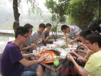 為(wei)了這(zhe)次燒烤(kao)活動能順利(li)進行(xing),班主任張老師已經提前(qian)聯系好了燒烤(kao)場地,采購好了食(shi)材和相關物(wu)品。活動當天,我們(men)師生幾十人,兵分兩路(lu)(lu),一路(lu)(lu)首先到匯西生態(tai)園(yuan),占領有利(li)燒烤(kao)位置;而另一路(lu)(lu)則(ze)于早上8:20準時(shi)從中心所(suo)在的四川大(da)(da)學大(da)(da)學科技園(yuan)出發,兩路(lu)(lu)人馬終在生態(tai)園(yuan)會師。