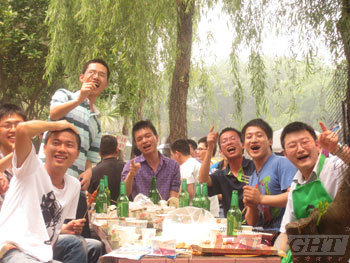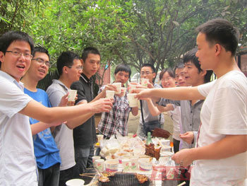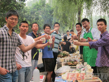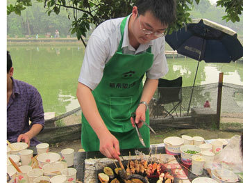 看!我(wo)(wo)們(men)第一(yi)(yi)組(zu)(zu)(zu)身材魁梧的(de)(de)(de)(de)(de)(de)黃(huang)(huang)(huang)洲(zhou)(zhou)同學(xue)已經(jing)圍(wei)(wei)上了(le)綠色的(de)(de)(de)(de)(de)(de)花布(bu)圍(wei)(wei)裙(qun),這(zhe)位平時敲(qiao)代(dai)碼的(de)(de)(de)(de)(de)(de)IT職場高手(shou),現在搖身一(yi)(yi)變,也有(you)(you)經(jing)驗豐富的(de)(de)(de)(de)(de)(de)主廚范兒(er)(er)(er)。有(you)(you)同學(xue)在一(yi)(yi)邊吆(yao)喝:“黃(huang)(huang)(huang)洲(zhou)(zhou),行不(bu)行啊?”黃(huang)(huang)(huang)洲(zhou)(zhou)得意的(de)(de)(de)(de)(de)(de)笑道:“瞧(qiao)好吧!等會(hui)兒(er)(er)(er)讓(rang)你們(men)嘗嘗咱(zan)的(de)(de)(de)(de)(de)(de)手(shou)藝。”別說(shuo),有(you)(you)了(le)這(zhe)個黃(huang)(huang)(huang)大(da)主廚的(de)(de)(de)(de)(de)(de)帶領分(fen)工,咱(zan)們(men)一(yi)(yi)組(zu)(zu)(zu)的(de)(de)(de)(de)(de)(de)學(xue)員燒烤起來手(shou)腳麻(ma)利,井然有(you)(you)序。讓(rang)我(wo)(wo)們(men)帶隊的(de)(de)(de)(de)(de)(de)班主任張老(lao)師(shi)只(zhi)有(you)(you)在旁(pang)邊豎(shu)起大(da)拇指夸獎的(de)(de)(de)(de)(de)(de)份(fen)兒(er)(er)(er)。再(zai)瞧(qiao)瞧(qiao)我(wo)(wo)們(men)第二組(zu)(zu)(zu),在就業專員黃(huang)(huang)(huang)老(lao)師(shi)的(de)(de)(de)(de)(de)(de)帶領下也毫不(bu)示弱(ruo),不(bu)一(yi)(yi)會(hui)兒(er)(er)(er),通(tong)過大(da)家的(de)(de)(de)(de)(de)(de)努力,二組(zu)(zu)(zu)燒烤的(de)(de)(de)(de)(de)(de)串串在灶臺上已經(jing)堆起了(le)一(yi)(yi)座小山。我(wo)(wo)們(men)行政(zheng)助理嚴老(lao)師(shi)帶領的(de)(de)(de)(de)(de)(de)第三組(zu)(zu)(zu)學(xue)員,更(geng)是求吃(chi)心切啊,神速(su)的(de)(de)(de)(de)(de)(de)他(ta)們(men)一(yi)(yi)小會(hui)兒(er)(er)(er)功夫(fu),已經(jing)準備(bei)就緒(xu),加炭生火,開始烤起來了(le)。看大(da)家都基(ji)本準備(bei)完畢,張老(lao)師(shi)提議大(da)家舉杯合影留念,記錄這(zhe)珍(zhen)貴的(de)(de)(de)(de)(de)(de)時刻。