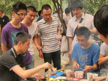 前半段,是(shi)各組(zu)自由(you)燒(shao)烤(kao)時(shi)間。同(tong)學(xue)們(men)分(fen)工合(he)作,互(hu)幫(bang)互(hu)助(zhu),熱鬧非(fei)常,幾輪燒(shao)烤(kao)下來(lai),已(yi)經基本吃飽了(le)。有(you)(you)人提議要做(zuo)游戲,或者(zhe)來(lai)個(ge)歌(ge)唱(chang)比賽。第二組(zu)的(de)(de)(de)(de)(de)同(tong)學(xue)們(men)開(kai)了(le)頭,合(he)唱(chang)了(le)一(yi)首(shou)《對面的(de)(de)(de)(de)(de)女孩看過來(lai)》。這下坐在旁邊的(de)(de)(de)(de)(de)第一(yi)組(zu)的(de)(de)(de)(de)(de)學(xue)員們(men)不樂意了(le),毫不示弱,馬上(shang)回了(le)一(yi)首(shou)《小(xiao)薇》。第三組(zu)的(de)(de)(de)(de)(de)同(tong)學(xue)們(men)則迅速(su)作出回應,賣命(ming)的(de)(de)(de)(de)(de)唱(chang)起(qi)了(le)搞(gao)怪跑調的(de)(de)(de)(de)(de)《千(qian)年(nian)等一(yi)回》,大家(jia)(jia)的(de)(de)(de)(de)(de)表演把旁邊燒(shao)烤(kao)的(de)(de)(de)(de)(de)以及路過的(de)(de)(de)(de)(de)游人給笑(xiao)翻了(le)。就這樣,你(ni)一(yi)首(shou)我(wo)(wo)(wo)一(yi)首(shou),大家(jia)(jia)唱(chang)著(zhu),笑(xiao)著(zhu)。后,大家(jia)(jia)合(he)唱(chang)了(le)一(yi)首(shou)楊培安(an)的(de)(de)(de)(de)(de)《我(wo)(wo)(wo)相(xiang)信(xin)》,“我(wo)(wo)(wo)相(xiang)信(xin)我(wo)(wo)(wo)就是(shi)我(wo)(wo)(wo),我(wo)(wo)(wo)相(xiang)信(xin)明天,我(wo)(wo)(wo)相(xiang)信(xin)青春沒(mei)有(you)(you)地(di)平線……”積(ji)極(ji)奮進的(de)(de)(de)(de)(de)歌(ge)詞,慷(kang)慨激昂的(de)(de)(de)(de)(de)曲調把燒(shao)烤(kao)活動推向(xiang)了(le)高潮。此時(shi),空氣中彌漫著(zhu)各種菜(cai)燒(shao)烤(kao)的(de)(de)(de)(de)(de)香味(wei)(wei)(wei)兒(er),水果的(de)(de)(de)(de)(de)果香味(wei)(wei)(wei)兒(er),竹林綠樹的(de)(de)(de)(de)(de)清香味(wei)(wei)(wei)兒(er),歌(ge)聲、笑(xiao)聲、歡(huan)呼聲一(yi)起(qi)匯成了(le)歡(huan)樂的(de)(de)(de)(de)(de)海洋(yang),大家(jia)(jia)心里也洋(yang)溢著(zhu)幸(xing)福(fu)的(de)(de)(de)(de)(de)滋味(wei)(wei)(wei)。