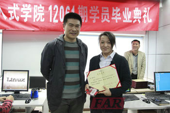 結(jie)業典(dian)禮后,華清(qing)遠見教育科(ke)技集團院長(chang)季老(lao)師親(qin)自為優(you)秀(xiu)(xiu)學(xue)(xue)員(yuan)頒(ban)發了優(you)秀(xiu)(xiu)學(xue)(xue)員(yuan)證(zheng)書,以表彰在(zai)學(xue)(xue)習和(he)項目(mu)實戰過程中成績突(tu)出的(de)學(xue)(xue)員(yuan)。這期的(de)優(you)秀(xiu)(xiu)學(xue)(xue)員(yuan)分(fen)別(bie)由(you)綜合評分(fen)高(gao)的(de)殷蔭、于(yu)洪溟、陳宇等四位(wei)同學(xue)(xue)獲(huo)得。院長(chang)季老(lao)師為學(xue)(xue)員(yuan)頒(ban)發了優(you)秀(xiu)(xiu)證(zheng)書和(he)獎品。