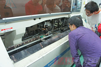 學員(yuan)們(men)(men)(men)先參(can)觀(guan)了(le)(le)smt的(de)(de)(de)生產(chan)流(liu)(liu)程,從(cong)生產(chan)的(de)(de)(de)第一塊芯片(pian)(pian)到大規模(mo)的(de)(de)(de)集成電(dian)路,從(cong)簡(jian)單的(de)(de)(de)單晶硅到納米級芯片(pian)(pian),同學們(men)(men)(men)紛紛感到神奇。學員(yuan)們(men)(men)(men)在(zai)滕華電(dian)子(zi)廠郭(guo)經理的(de)(de)(de)引導下,通(tong)過(guo)視頻和圖(tu)片(pian)(pian)對微(wei)電(dian)子(zi)有了(le)(le)更(geng)加深(shen)入的(de)(de)(de)認識,并(bing)結合課(ke)堂上所(suo)學的(de)(de)(de)理論知(zhi)識提出了(le)(le)相(xiang)關問題,郭(guo)經理也對學員(yuan)們(men)(men)(men)的(de)(de)(de)疑問一一進(jin)行了(le)(le)解答。接(jie)著(zhu),郭(guo)老師現(xian)場為大家(jia)講解了(le)(le)電(dian)子(zi)產(chan)品的(de)(de)(de)生產(chan)流(liu)(liu)程,激(ji)勵同學們(men)(men)(men)努力學好專業(ye)知(zhi)識,積(ji)極(ji)投身與微(wei)電(dian)子(zi)技術的(de)(de)(de)發展潮流(liu)(liu)中。在(zai)參(can)觀(guan)過(guo)程中理論與實踐相(xiang)結合,不僅拓寬了(le)(le)學員(yuan)們(men)(men)(men)的(de)(de)(de)專業(ye)知(zhi)識視野(ye),大家(jia)從(cong)中還得到了(le)(le)不少(shao)的(de)(de)(de)收獲。參(can)觀(guan)完(wan)smt的(de)(de)(de)生產(chan)流(liu)(liu)程后,郭(guo)經理帶領學員(yuan)們(men)(men)(men)到企業(ye)的(de)(de)(de)其他地方進(jin)行參(can)觀(guan),從(cong)辦公(gong)室(shi)、休息室(shi)、餐(can)廳到生產(chan)車間等地方,同學們(men)(men)(men)感受(shou)著(zhu)良好的(de)(de)(de)企業(ye)文化(hua)(hua),對現(xian)代化(hua)(hua)企業(ye)有了(le)(le)更(geng)深(shen)入的(de)(de)(de)了(le)(le)解。