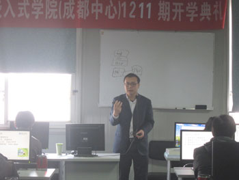| 圖一、成都中心負責人陶老師為開學典禮致辭 | 圖二、成都中心潘老師講解課程體系 |