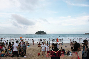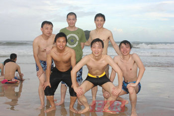 16點(dian)30分,我們(men)終于來到(dao)了西(xi)沖(chong),遠遠望去,這(zhe)里的(de)(de)海(hai)水真的(de)(de)很(hen)清很(hen)美,在(zai)臺風(feng)的(de)(de)影(ying)響下(xia)(xia),海(hai)浪比(bi)平常稍大,情侶島屹立在(zai)海(hai)中(zhong)心(xin),海(hai)邊(bian)很(hen)多游(you)客正在(zai)歡(huan)樂(le)的(de)(de)戲水,真美啊!得(de)到(dao)景點(dian)負責人的(de)(de)許(xu)可后,我們(men)當然(ran)也按捺不(bu)住激動(dong)的(de)(de)心(xin)情,放下(xia)(xia)行(xing)禮,換上泳裝,直奔(ben)海(hai)洋而去。剛開始我們(men)只是在(zai)海(hai)邊(bian)享(xiang)受了一下(xia)(xia)海(hai)水的(de)(de)溫暖,一會兒,我們(men)紛(fen)紛(fen)找到(dao)了感覺,各種花樣(yang)竟出。不(bu)游(you)泳的(de)(de)學(xue)員也在(zai)淺海(hai)打起了水仗(zhang),到(dao)處歡(huan)聲笑語。