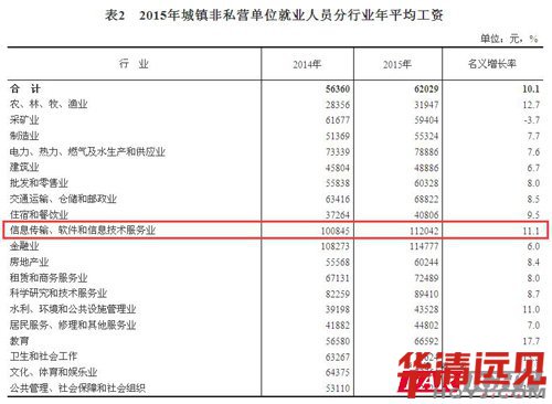 5月13日,統計局(ju)公布了2015年(nian)各個行(xing)業(ye)(ye)(ye)年(nian)平(ping)均(jun)工(gong)資數(shu)據(ju),各行(xing)業(ye)(ye)(ye)表現(xian)不一(yi)。總體(ti)來看,全(quan)國城鎮非私營單位年(nian)均(jun)工(gong)資為62029元,全(quan)國城鎮私營單位年(nian)均(jun)工(gong)資為39589元,而我們IT人較為關注的IT行(xing)業(ye)(ye)(ye)工(gong)資水(shui)平(ping)如何呢?