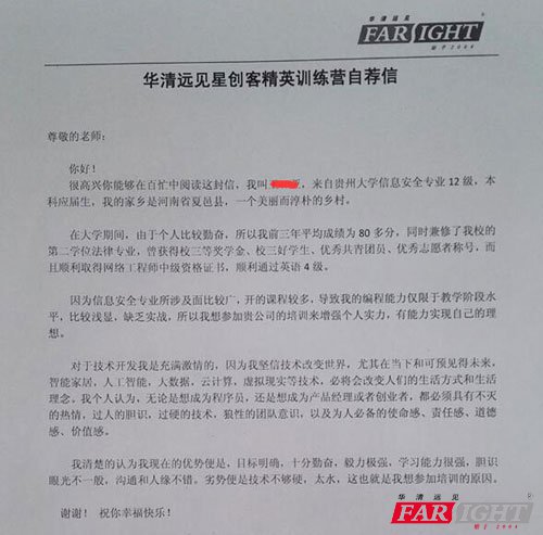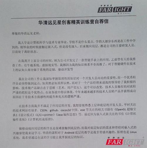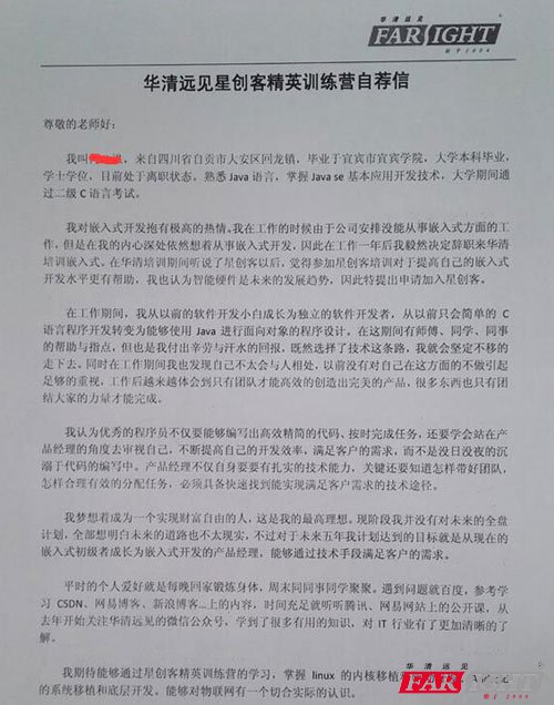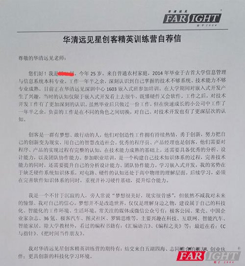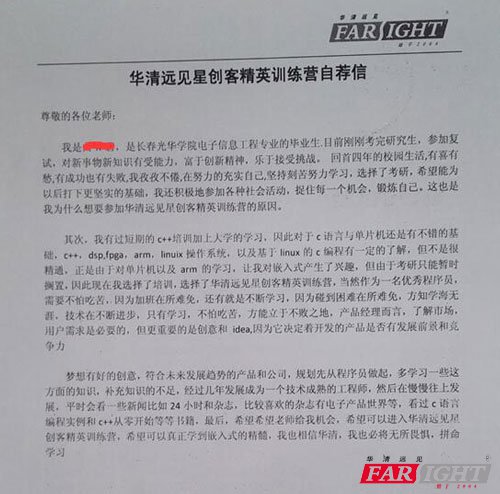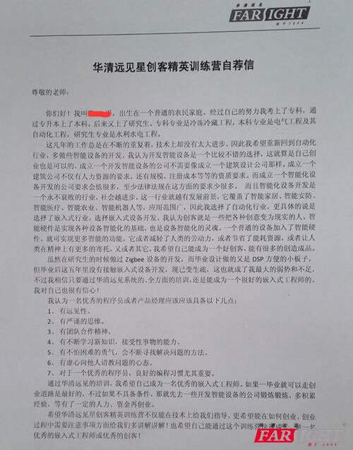 |   “星創客”訓練營開班在即,入學名額不多啦!  時間(jian):2016-04-08作者:華(hua)清遠(yuan)見 自從“星(xing)創客”精(jing)英訓(xun)練營推出以(yi)來,華清遠(yuan)見全國九大(da)(da)分(fen)心都(dou)出現了(le)(le)(le)大(da)(da)批同學電話、郵件咨詢,還(huan)有很多人(ren)上門訪問,其中有些是(shi)大(da)(da)三、大(da)(da)四的在校生,碩士(shi)生,也有在職(zhi)程序員,技術(shu)人(ren)員等。了(le)(le)(le)解星(xing)創客精(jing)英訓(xun)練營的情(qing)況。一波又一波的筆試(shi)(shi)、面試(shi)(shi)可把我們(men)的老師忙壞了(le)(le)(le)。經過層層的測試(shi)(shi)與選拔,已經有一批同學接到了(le)(le)(le)入學通知(zhi)。目前(qian)所剩名(ming)額已經不(bu)多了(le)(le)(le),想要報名(ming)的同學要抓緊(jin)啦(la)! 通過與(yu)前來咨詢的(de)同學們(men)溝(gou)通我們(men)了解到,他們(men)選擇“星創客”精(jing)(jing)英(ying)(ying)訓(xun)練營的(de)重要的(de)原因還是嵌入(ru)(ru)式行業發(fa)(fa)展(zhan)的(de)前景(jing)。嵌入(ru)(ru)式技術真的(de)太(tai)牛(niu)了,身邊好多(duo)智(zhi)(zhi)能(neng)硬件產品都(dou)是基礎(chu)嵌入(ru)(ru)式技術開(kai)發(fa)(fa)。比如智(zhi)(zhi)能(neng)穿戴設備(bei),VR/AR,無人機,智(zhi)(zhi)能(neng)機器人等,不斷地(di)吸引著(zhu)(zhu)人們(men)的(de)眼球(qiu),也改變著(zhu)(zhu)我們(men)的(de)生(sheng)活。另外從職(zhi)業規劃上來說,要選擇,就要選擇一個(ge)在(zai)未(wei)來N年內都(dou)極具前景(jing)的(de)職(zhi)業。目前市場上精(jing)(jing)通嵌入(ru)(ru)式底(di)層開(kai)發(fa)(fa)、系(xi)統開(kai)發(fa)(fa)、系(xi)統移(yi)植的(de)人才非常(chang)稀(xi)缺,而在(zai)星創客精(jing)(jing)英(ying)(ying)訓(xun)練營就是重點學習這些(xie)知識。華清遠見在(zai)嵌入(ru)(ru)式培(pei)訓(xun)領域的(de)行業地(di)位,包括口碑影響力(li)及強大的(de)研發(fa)(fa)實(shi)力(li),對(dui)于前來咨詢的(de)同學都(dou)是非常(chang)認(ren)可(ke)的(de)。 看看一大波發來的自薦信,個個都是棒棒噠!愛學習,有夢想,想要挑戰自己,如果你也是這樣的,那么也歡迎你加入星創客精英訓練營,成就更好的自己!