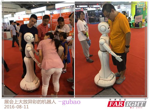 下面是(shi)芯(xin)合科(ke)技參加(jia)展會的照片(pian),胡主管(guan)特地囑咐(fu)他們,回來給學生們看(kan)看(kan)。“第(di)一張是(shi)gubao在跟這位女士問(wen)好” “第二張是(shi)觀眾在跟(gen)gubao比個子,雖然圖片中gubao比這個觀眾矮了(le)一頭多,可(ke)她卻是(shi)機器(qi)人中的大個子呦!她有1.4米的身高(gao)。”胡主管介紹說。 臨(lin)行,她還把自己在(zai)展會上錄制的(de)小視頻發給他們(men)(men),拜托兩位老(lao)師帶(dai)給星創客,希望(wang)星創客們(men)(men)能看到,有學員對機器人感興趣,歡迎加入像芯合科技這樣的(de)創業(ye)公司。