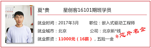 |   星創客3期高薪戰報第二彈  4個18萬年薪小伙共赴芯片名企  時間(jian):2017-04-10作(zuo)者(zhe):華清(qing)遠見 華清遠見有一(yi)(yi)個神奇的班級——星(xing)創(chuang)(chuang)客(ke)精(jing)英(ying)訓練營,之所(suo)以神奇是(shi)因為它匯集(ji)了(le)眾(zhong)多創(chuang)(chuang)客(ke)愛好者/技術精(jing)英(ying),也送走了(le)一(yi)(yi)批(pi)又(you)一(yi)(yi)批(pi)的高(gao)端嵌入(ru)式/Android底(di)層開(kai)發(fa)人才。目前,星(xing)創(chuang)(chuang)客(ke)3期班(16101期)已順利畢業,就業老師正緊鑼密(mi)鼓的邀(yao)約實力名(ming)企(qi)上門(men)求賢。這不,前段時(shi)間邀(yao)請到了(le)芯(xin)片(pian)研發(fa)大牛企(qi)業——新*線,一(yi)(yi)番嚴格(ge)的筆(bi)試面試后,4位星(xing)創(chuang)(chuang)客(ke)小伙兒脫(tuo)穎(ying)而出,獲得(de)了(le)這家名(ming)企(qi)年(nian)薪18萬的offer!