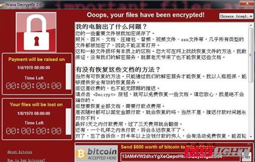 強行科普: WannaCry(又叫Wanna Decryptor),是一種“蠕蟲式”的勒索病毒軟件,大小3.3MB,由不法分子利用美國安全局(NSA)泄露的危險漏洞“EternalBlue”(永恒之藍)進行傳播。該惡意軟件會掃描電腦上的TCP 445端口(Server Message Block/SMB),以類似于蠕蟲病毒的方式傳播,攻擊主機并加密主機上存儲的文件,然后要求以比特幣的形式支付贖金。勒索金額為300至600美元。