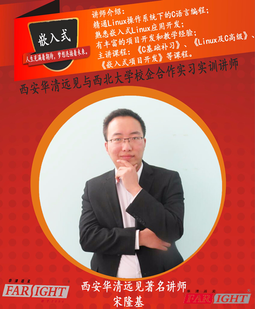 此(ci)次(ci)實(shi)習(xi)實(shi)訓(xun)講(jiang)師由西安(an)華清遠見著(zhu)名講(jiang)師宋(song)隆(long)基老(lao)師講(jiang)解,宋(song)老(lao)師有(you)豐富(fu)的項目(mu)開(kai)發(fa)和(he)教(jiao)學經驗,精(jing)通Linux操作系統下(xia)的C語言編程和(he)Linux應用(yong)開(kai)發(fa)。