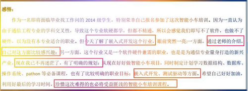 此(ci)次實(shi)訓同(tong)學(xue)(xue)們能(neng)(neng)將(jiang)理論(lun)知(zhi)識融(rong)會貫通,將(jiang)所(suo)學(xue)(xue)知(zhi)識應用在嵌入(ru)式(shi)智能(neng)(neng)小車開發(fa)(fa)上,激發(fa)(fa)了他們對嵌入(ru)式(shi)技術的研發(fa)(fa)熱情,為今后工(gong)作或者創業提供(gong)了好的方向和知(zhi)識儲備,同(tong)時激勵學(xue)(xue)生們不斷提高自我(wo)專業素養(yang),熟練掌(zhang)握(wo)專業技能(neng)(neng),為以(yi)后就業奠定堅實(shi)基礎(chu),希望同(tong)學(xue)(xue)們可以(yi)越(yue)(yue)來(lai)越(yue)(yue)優秀。