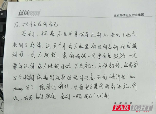 開學(xue)典(dian)禮(li)即將步(bu)入尾(wei)聲的(de)時(shi)候,我發現一位學(xue)員(yuan)已經開始給五個(ge)月后的(de)自己寫(xie)的(de)一封信(xin)了,信(xin)中(zhong)是這樣(yang)說的(de):