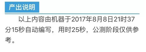 8月8日晚,四川九寨溝發生了7.0級地震。一時間,各家媒體爭相報道。 然而,正當各家媒體奮筆疾書編輯地震報道時,一個由智能寫稿機器人撰寫的報道率先發布,它用25秒寫完了關于這次地震的速報,通過地震臺網官方微信平臺推送,全球首發。