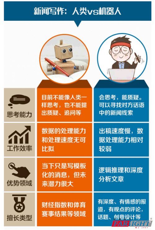 當我等小編還處在驚愕中時,機器人已經迅速完成了數據挖掘、數據分析、自動寫稿的全過程。一時間,“記者、編輯會不會被寫稿機器人代替?”問題成為媒體圈熱議的話題。那么,未來某一天,智能寫稿機器人真的會代替人類完成寫稿工作嗎?今天,小編就和大家淺談一下這個問題。 寫稿機器人到底是什么? 寫稿機器人,顧名思義就是編輯文稿的啊。用標準語言形容它,寫稿機器人就是能根據算法在第一時間自動生成稿件,瞬時輸出分析和研判,一分鐘內將重要資訊和解讀送達用戶的人工智能軟件。 其實,機器人寫稿早已不是什么新鮮事。寫稿機器人的出現早可以追溯到2009年,一款名為StatsMonkey的人工軟件完成了一篇關于美國的職業棒球大聯盟季后賽的新聞稿,速度完勝人類記者。由此,寫稿機器人可謂是一朝得名萬家曉。 此后寫稿機器人陸續出現在大眾視野中,包括洛杉磯時報、《紐約時報》在內的國外知名媒體都開始嘗試用機器人寫稿,引起了不小的反響。而在,關于寫稿機器人的研發工作是從2015年開始的,2016年投入測試,2017年開始接入各大媒體和社交平臺投入使用。從實驗室走入現實,寫稿機器人代替部分記者編輯工作已是大勢所趨,那么,它真的可以完全代替人類完成編稿工作嗎? 智能寫稿機器人VS人類,誰更勝一籌