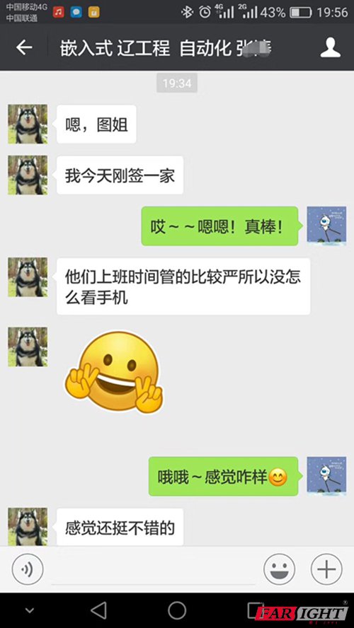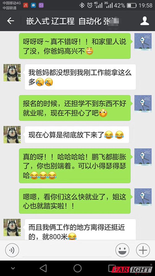 大家(jia)(jia)還記得上期(qi)那個去杭州不到(dao)兩天時間就找到(dao)工作(zuo)的(de)華清小網紅嗎?這不,時隔不久,他的(de)小伙伴(ban)也(ye)發來喜訊(xun)了,兩家(jia)(jia)公(gong)司竟(jing)然只有(you)(you)短短800米(mi)的(de)距(ju)離(li),華妹想問你(ni)倆是照(zhao)著1000米(mi)以(yi)內的(de)距(ju)離(li)投(tou)的(de)簡歷(li)嗎?難(nan)道有(you)(you)什么(me)“奸(jian)情(qing)”,哦不,友情(qing)?不過,看到(dao)你(ni)倆現在過得這么(me)幸福,華妹也(ye)甚感欣慰啊! 張同(tong)學也(ye)高興地說,父母之前一直擔心我能不(bu)(bu)能找(zhao)(zhao)到工作(zuo),但沒想到這么快找(zhao)(zhao)到了,薪資還遠(yuan)遠(yuan)超過(guo)他們的(de)(de)預(yu)期,現在懸著的(de)(de)心總算徹底(di)放下來了,非常感謝華清遠(yuan)見,要不(bu)(bu)然自己現在還不(bu)(bu)知道(dao)什么樣(yang)子呢。 這里有(you)截圖(tu)哦,不信你看(kan)。
