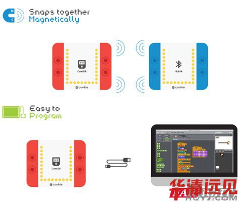 Microduino mCookie號稱腦洞達人的愛,它讓(rang)Microduino獲(huo)得了(le)兼容(rong)樂(le)高玩具的能(neng)(neng)力,Microduino mCookie 每(mei)個(ge)(ge)模(mo)塊制作的標(biao)準相同,功(gong)能(neng)(neng)用(yong)顏色進行區分,方便(bian)制作者(zhe)通(tong)過堆疊來連接和添加每(mei)個(ge)(ge)模(mo)塊。Microduino mCookie 模(mo)塊的四角里內置了(le)四個(ge)(ge)磁石(shi),制作者(zhe)能(neng)(neng)夠迅速的連接和添加 mCookie 模(mo)塊單元,不(bu)需要焊接等復雜的操作,有意思的是(shi)相互不(bu)兼容(rong)的模(mo)塊,會通(tong)過磁力「拒絕」對方。
