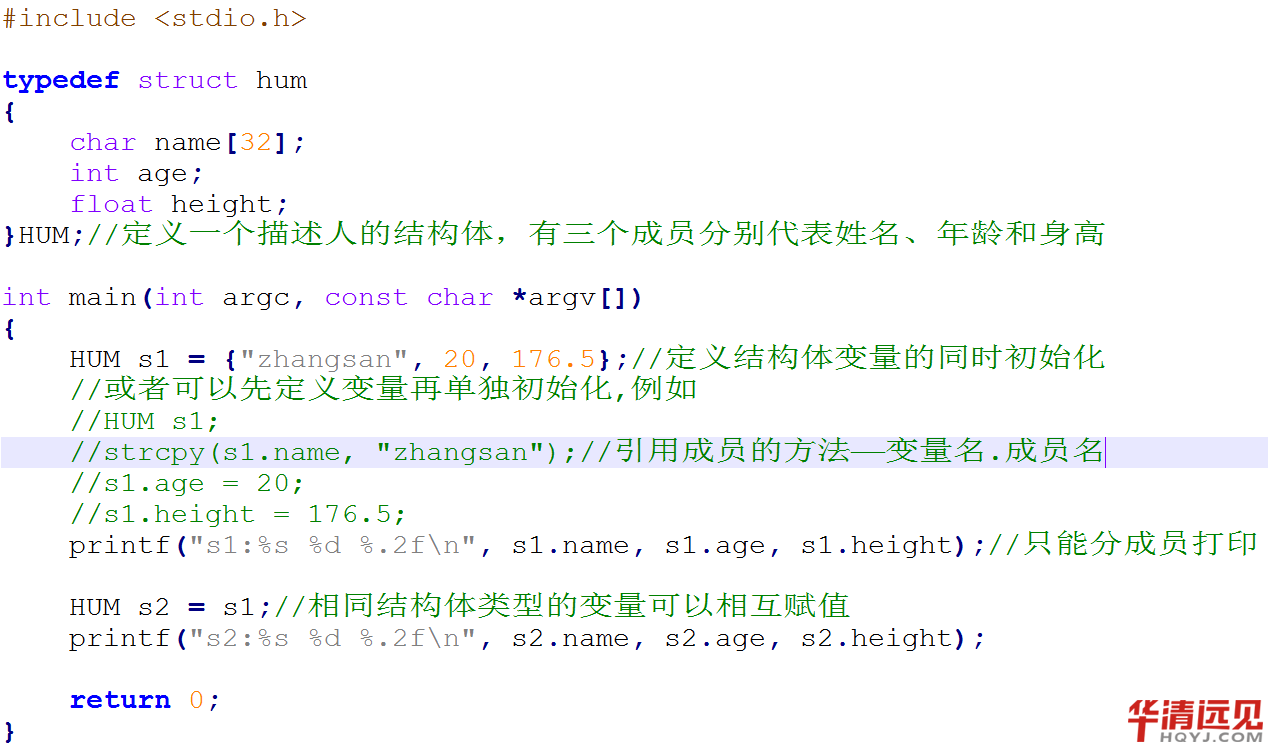 |   結構體  時(shi)間:2018-04-16作者:華清遠見 結構體的概念 結(jie)構體(ti)屬于C數(shu)據(ju)類(lei)型中的構造數(shu)據(ju)類(lei)型(Composite Data Types),在結(jie)構體(ti)中可以包含若干(gan)個不同(tong)數(shu)據(ju)類(lei)型和不同(tong)意義的數(shu)據(ju)項,從(cong)而使這些數(shu)據(ju)項組合起來反映某(mou)一個信息,這些數(shu)據(ju)項稱為結(jie)構體(ti)的成員(yuan)(member)。 舉個例子: