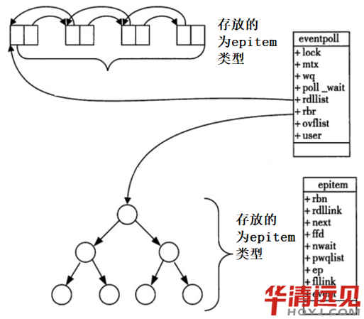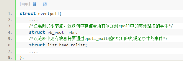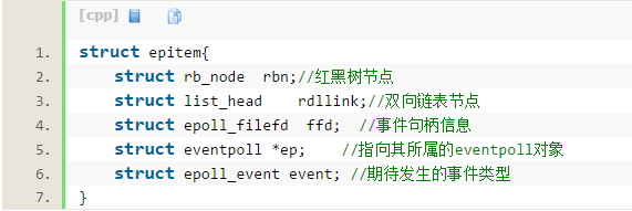 每一個(ge)epoll對象(xiang)都有一個(ge)獨(du)立(li)的eventpoll結構(gou)體(ti),用于(yu)存放通(tong)(tong)過epoll_ctl方法向epoll對象(xiang)中添加(jia)進來(lai)的事(shi)(shi)件。這些事(shi)(shi)件都會掛(gua)載在紅(hong)黑樹中,如此,重復(fu)添加(jia)的事(shi)(shi)件就可(ke)以通(tong)(tong)過紅(hong)黑樹而高效的識別出來(lai). 而所有添加到epoll中的事(shi)件都(dou)會(hui)與設備(網卡)驅(qu)動程(cheng)序(xu)建立回(hui)調(diao)(diao)關系,也就(jiu)是說,當相應的事(shi)件發(fa)生(sheng)時會(hui)調(diao)(diao)用這(zhe)個回(hui)調(diao)(diao)方法。這(zhe)個回(hui)調(diao)(diao)方法在內核中叫ep_poll_callback,它會(hui)將發(fa)生(sheng)的事(shi)件epitem添加到rdlist雙鏈表中。 在epoll中,對于每(mei)一個事件,都會(hui)建(jian)立一個epitem結構(gou)體,如下所示: