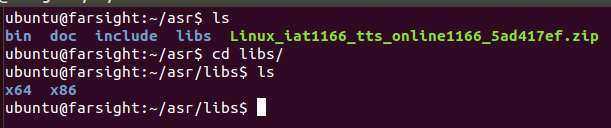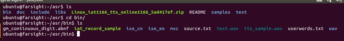 bin目錄(lu)下面是我們的(de)(de)(de)生成的(de)(de)(de)可執(zhi)行(xing)的(de)(de)(de)文(wen)件; doc目錄是我們的api函(han)數接口(kou)的參考的文檔; include目錄下面(mian)是我們的(de)(de)編譯后的(de)(de)可(ke)執行(xing)文件用到的(de)(de)頭文件; libs是我們的程序(xu)用到(dao)的庫; samples目錄下面是簡單的語音合(he)成、語音識別、語音轉文字的demo; 切(qie)換到我們(men)的(de)samples下面的(de)iat_record_sample的(de)語音識別的(de)demo,source 32bit_make.sh,在(zai)我們(men)的(de)bin目(mu)錄下生成(cheng)可(ke)執行文件(jian)iat_record_sample