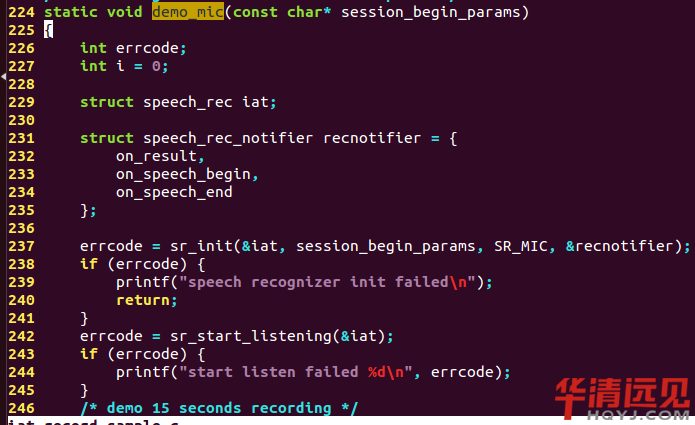 為(wei)了實現一直輸(shu)入,在我(wo)們(men)的while(1)中調(diao)用(yong)demo_mic,其(qi)中demo_mic的sr_init、sr_start_listening、sr_stop_listening實現我(wo)們(men)的語音的文件的起(qi)始和結束