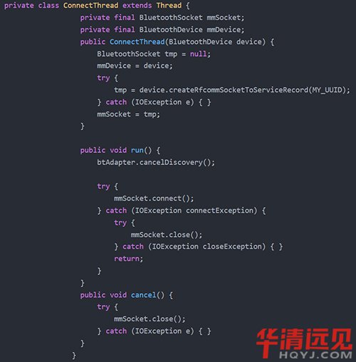 我們假定存在外部藍牙設備,即存在藍牙的服務端,在此只考慮藍牙客戶端的情況。在執行藍牙連接之前,一定要取消藍牙發現,取消藍牙發現也挺簡單的。只需要調用BluetoothAdapter.cancelDiscovery();由于藍牙連接是一個阻塞的方法,因此,我們新建一個線程實現藍牙連接是一個不錯的方式,如果在UI線程中直接調用藍牙連接的方法,很有可能造成ANR錯誤,于是直接上代碼: