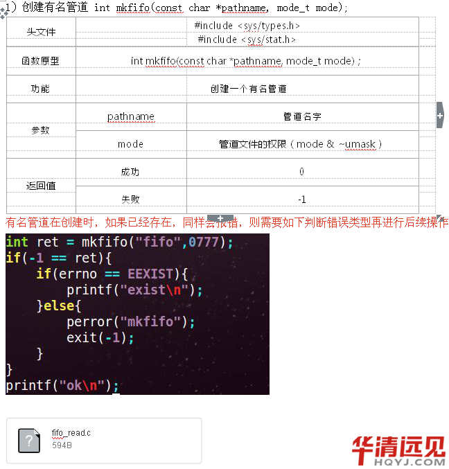 1)先(xian)在(zai)某(mou)一個進程中使用mkfifo()在(zai)內核空間中創(chuang)建(jian)有名管道(在(zai)文件系統中