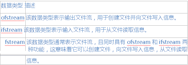 C++ 中另一個標準(zhun)庫 fstream,它定義了三(san)個新(xin)的(de)數據類型: