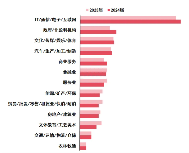 智聯招聘調(diao)研數據(ju)顯示,2024屆(jie)求(qiu)職(zhi)畢業生(sheng)期望行(xing)(xing)業中,IT/通(tong)信/電(dian)子/互聯網、政府/非盈利機構、文化/傳媒/娛樂/體育行(xing)(xing)業位列(lie)前三,占比(bi)分(fen)別為26.4%、9.4%、8.9%。